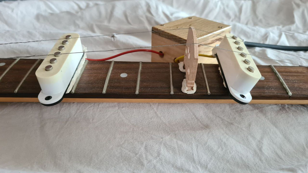 Two pickups are placed on the fingerboard, in order to amplify the two prepared strings, split in two parts by violin bridge.